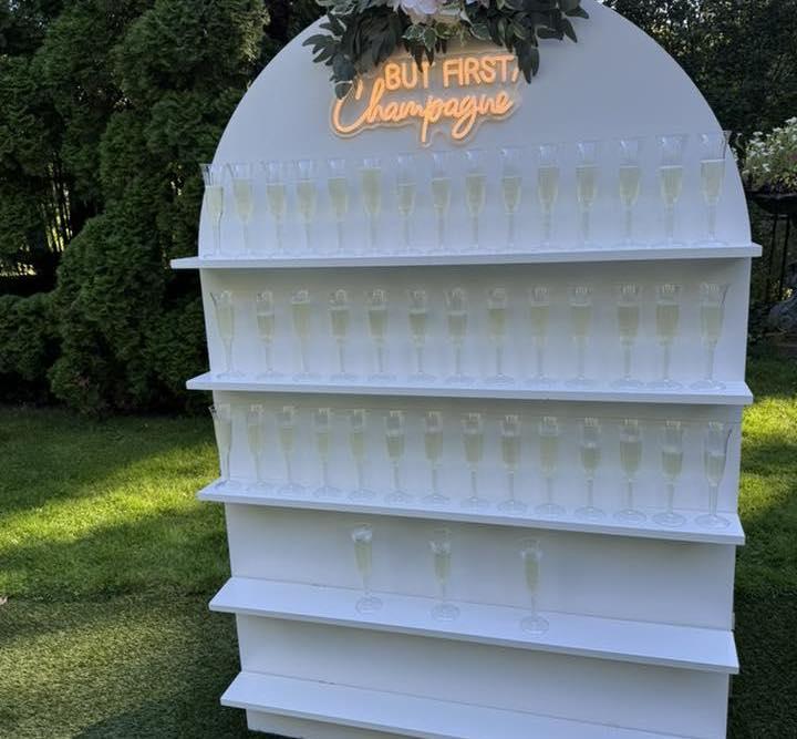 Add a statement piece to your celebration with our Champagne Wall enhancement. Designed to serve as both a functional bar feature and a stunning visual moment, the champagne wall creates an elevated guest experience from the first pour. Perfect for cocktail hour or a celebratory toast, it’s a beautiful way to welcome guests and add a touch of effortless luxury to your wedding day. Optional 75 disposable cups/flutes: +$50. Champagne not included