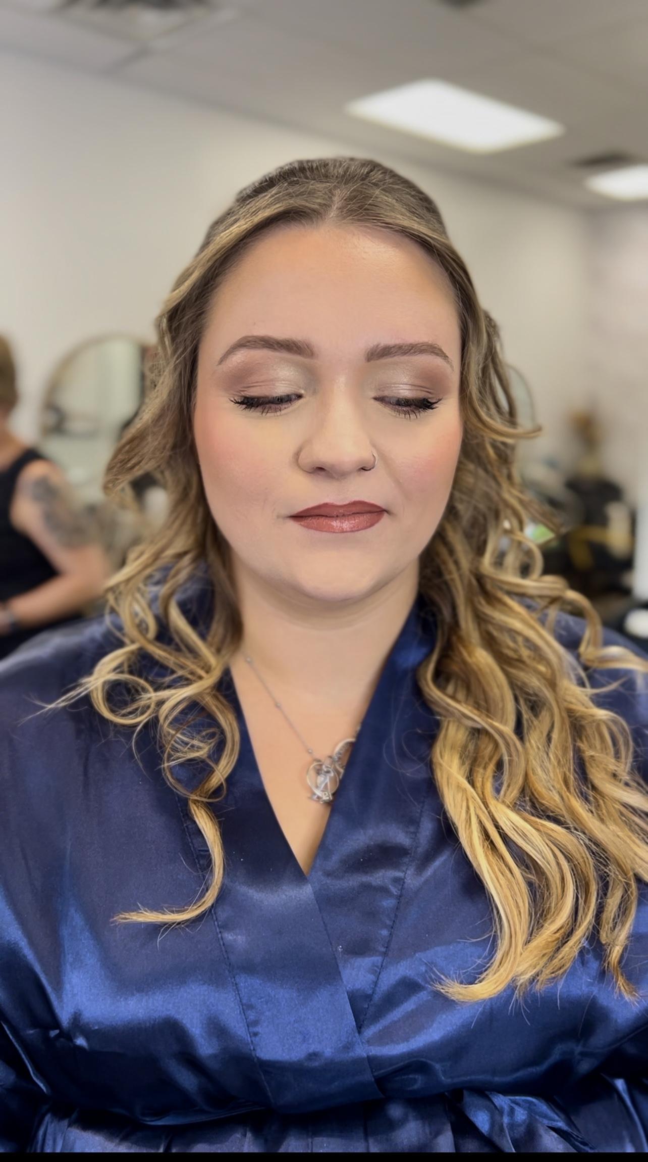 BRIDES ONLY Features a customized makeup look discussed during the trial, tweaks encouraged. Choose between a matte or glowy finish. Enjoy Red Light Therapy to boost circulation and collagen while promoting relaxation to ease pre-wedding nerves. Along w/ NuFace technology for toning and contouring, offering quick, painless, and instant results. Skin prep is key—hydrating, brightening, and smoothing your skin with professional-grade products ensures a radiant finish.