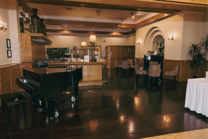 This room is the perfect area to meet all your needs for any event. Located on the main level of the clubhouse, this elegant room is complete with floor-to-ceiling windows overlooking the golf course and beautiful garden, a built-in marble bar and lounge area, an authentic 1920s original fireplace, a canopied outdoor terrace, and a gleaming dance floor. Trumpeter's room can comfortably seat 125 guests but accommodates up to 200 for a cocktail reception.