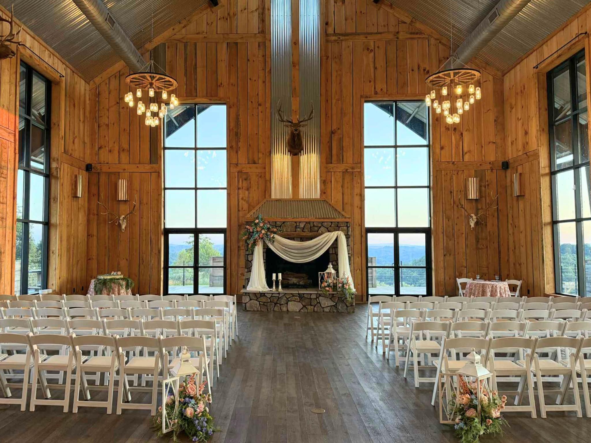 Nestled in the heart of the Appalachian Mountains, our dual property venue blends natural and rustic elements with show stopping spaces. The Grand Hall features a 4,500-square foot banquet/event room with seating for 300. A grand fireplace greets visitors as they enter the building. The space opens out to a 2,000-square-foot observation deck providing panoramic views of the Southwest Virginia mountains. It also features a 400-square-foot conference space suitable for small gatherings and is also equipped with a counter and sink for catering functionality. Our banquet rooms are customizable and can host 40-200 guests! A bridal suite equipped with a half bath and dual mirrors and counters is an available add-on. With multiple outdoor ceremony spaces available. A barn for smaller weddings or pre-wedding events. On-site lodging available on both properties.