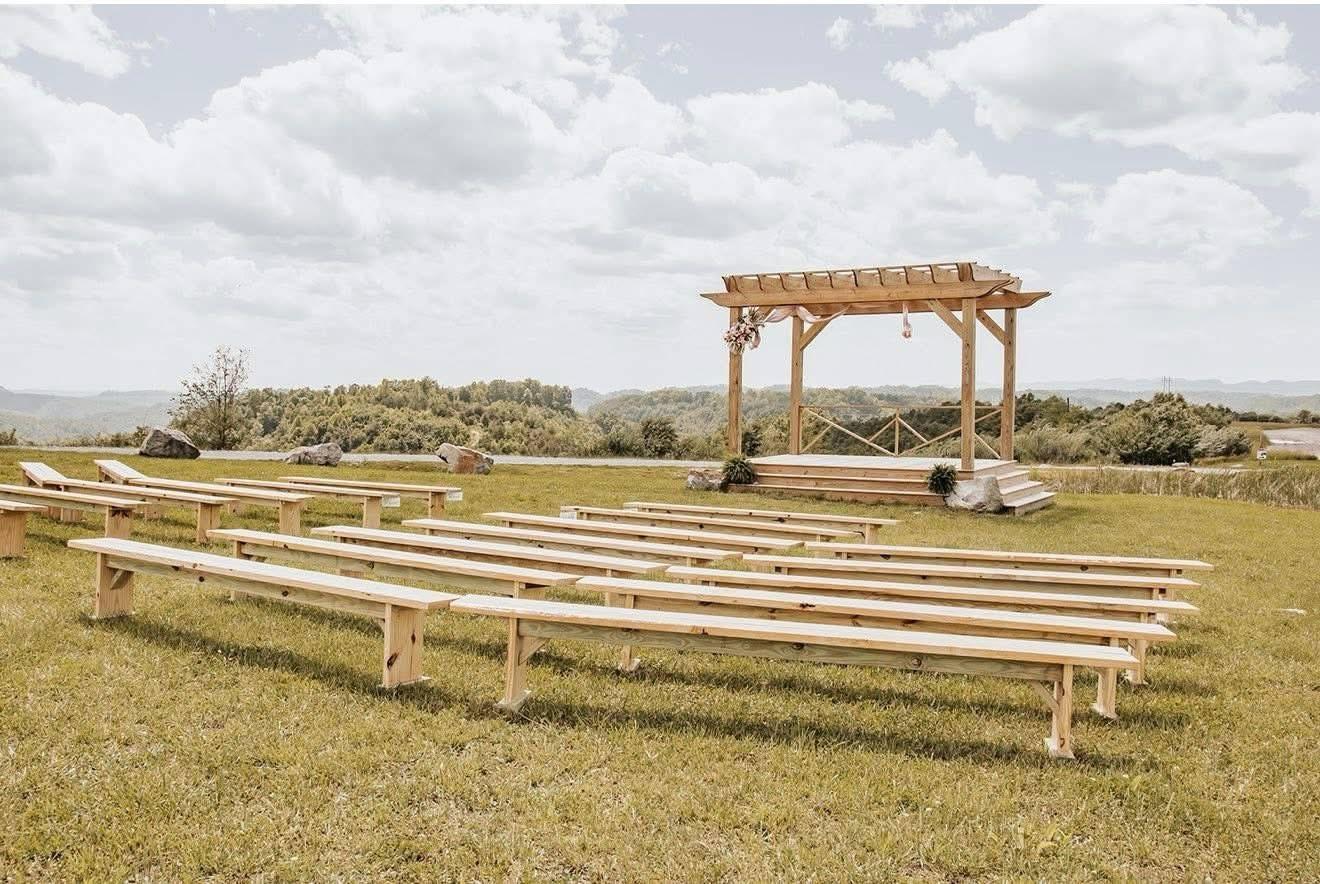 This 2024 build of a wooden pergola to be used as a ceremony location, as well as coordinating wooden benches that seat roughly 200 guests. Located steps from The Great Hall and Bridal Suite