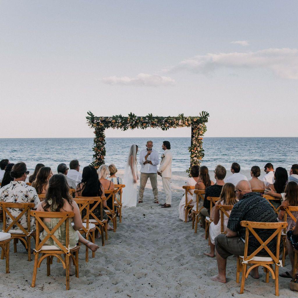 The most memorable white sand beach wedding with the breathtaking Bahia de los Sueños behind