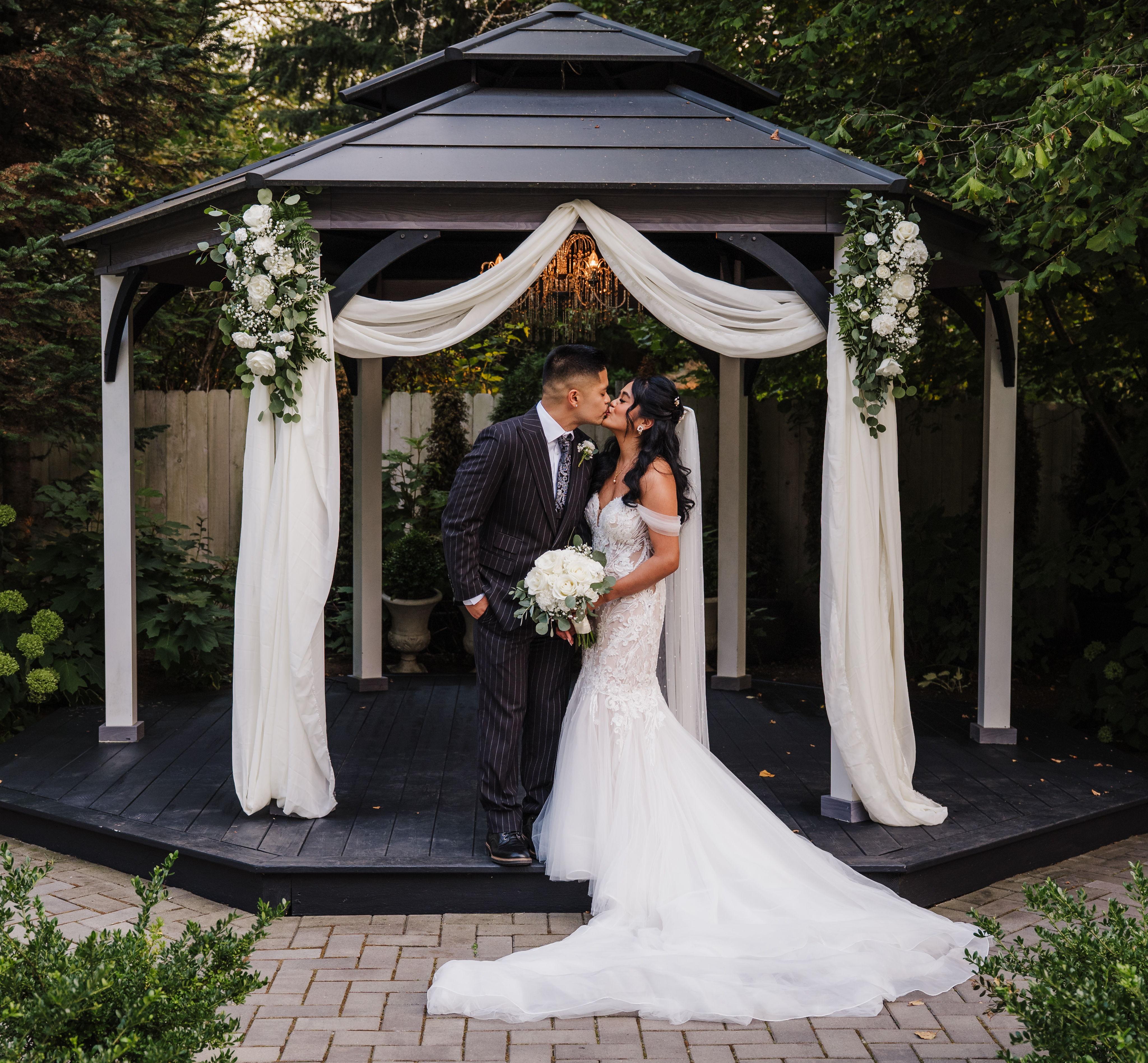 Beautiful custom gazebo with lush greenery background with crystal chandelier hanging from center.