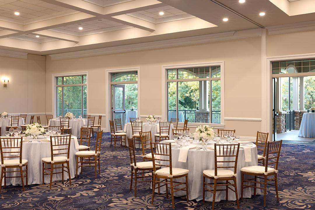 This ballroom showcases a country club, rustic-chic vibe. Natural light streams through floor-to-ceiling windows and an outdoor terrace overlooks the golf course.