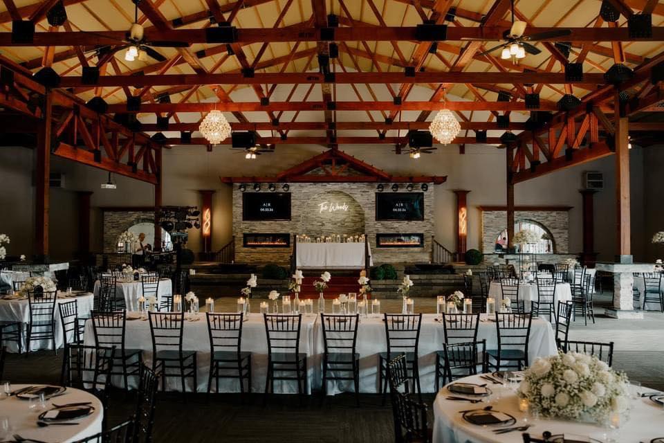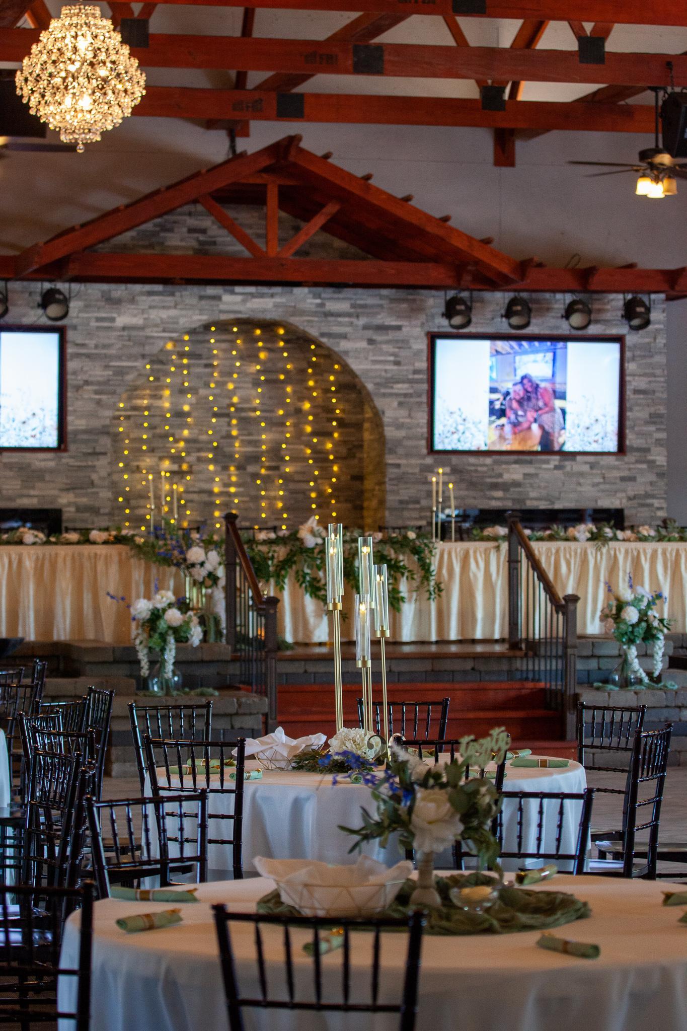 - 40 round tables (8 per table) - 10 round cocktail tables - 4 eight-foot tables - 4 six-foot tables - 400 white resin chairs (for outdoor ceremony) - 300 mahogany Chiavari chairs (for reception center) - 5 high chairs - 6 luxury couches and chairs - Indoor stage - Outdoor stage - Surround sound audio - Private bridal suite lounge with a three-person makeup studio - Private restroom - Leg and foot massager - Bridal bar with refrigerator and private balcony - 2 arcade games - Photography backdrops - Outdoor furniture - Artificial floral arrangements - Over 60 cylinder vases - Tons of decor - Wedding signs - Free overnight parking - Wi-Fi - Bluetooth microphones - Dance lighting - Grills - Champagne Wall