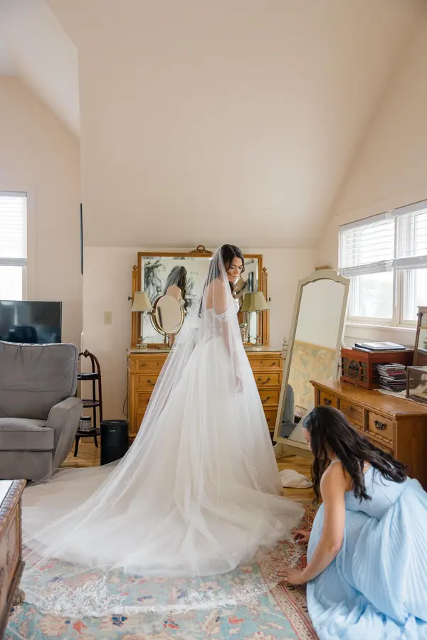 Wedding parties have access to our property from 1:00pm Thursday to 1:00pm Sunday, but they only have access to the private residence on the day of the ceremony, from 8:00am until the start of the ceremony. This large residence offers separate space and bathrooms for both bridal parties to access. This large open-concept home, wrap-around porch, spiral staircase, laundry room, and breathtaking bridal suite are perfect for 10-25 people to get ready!
