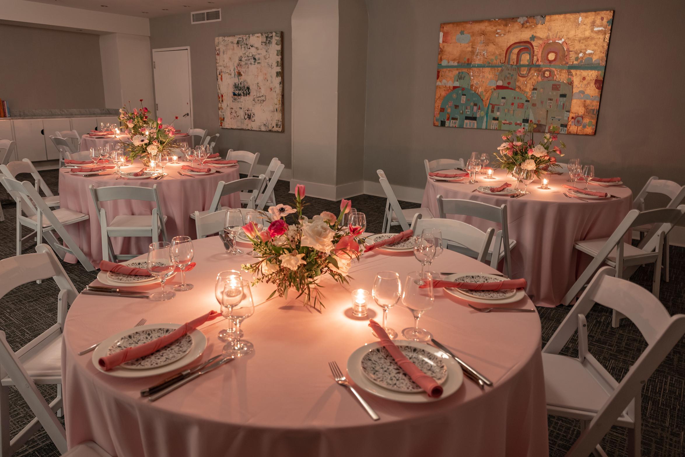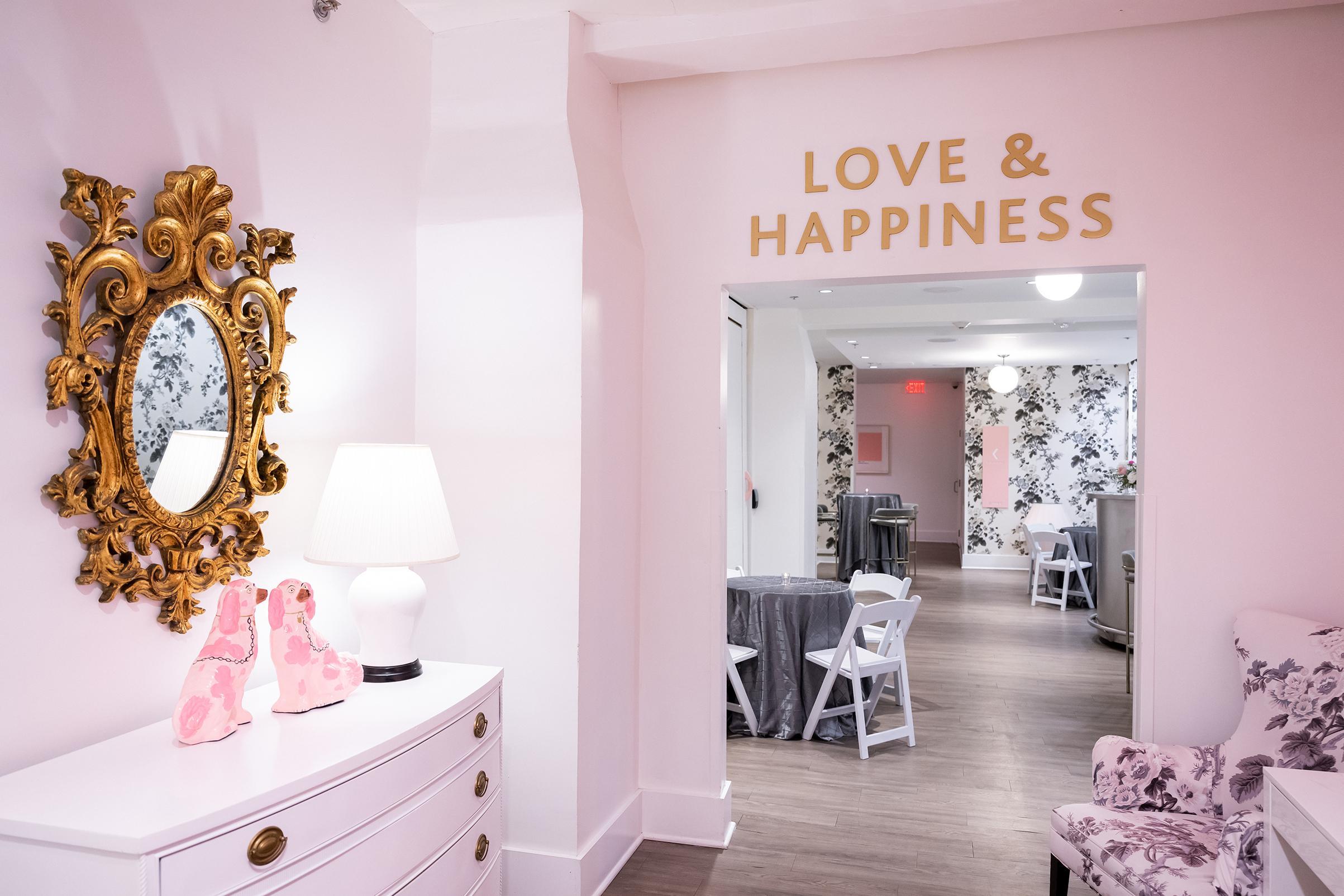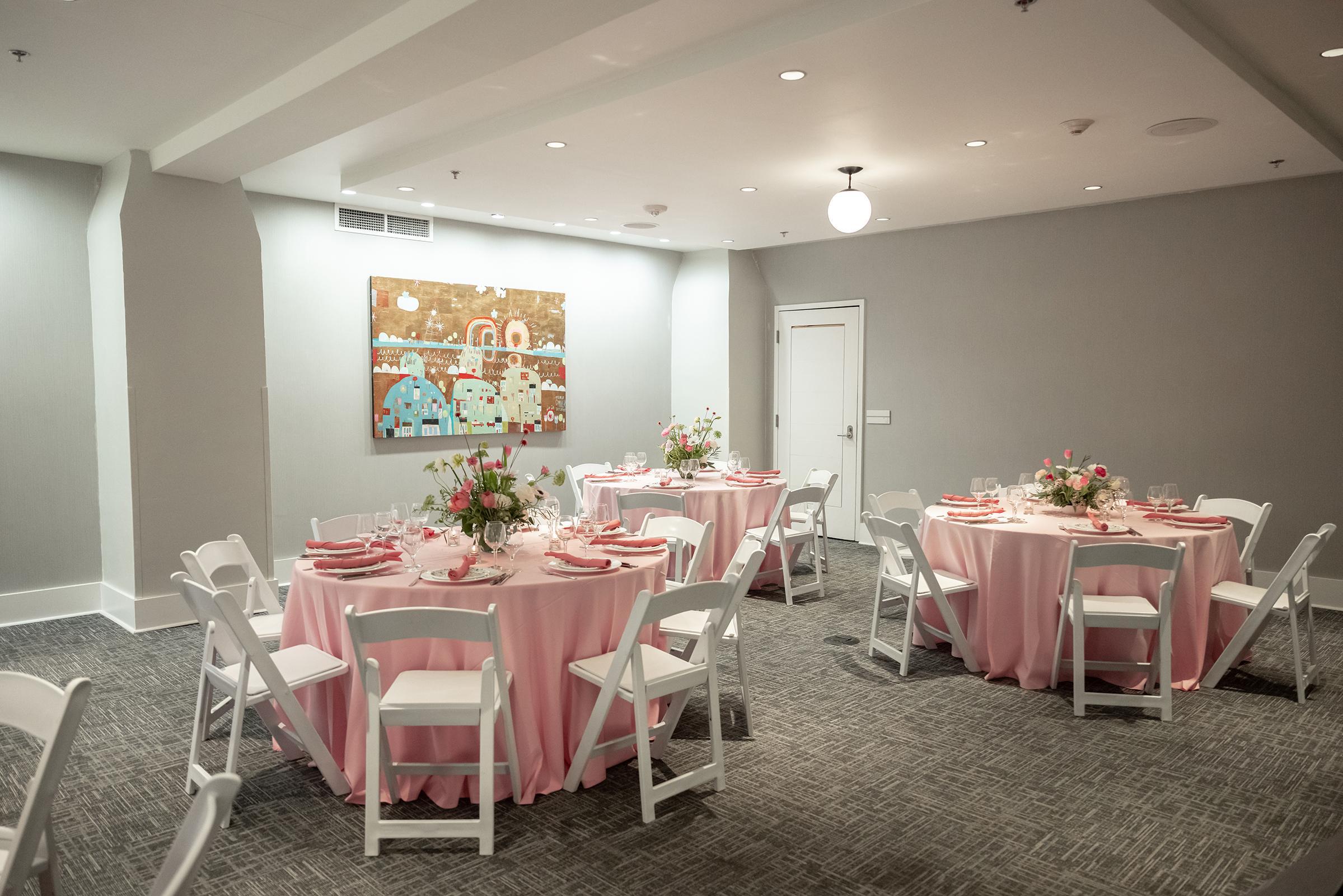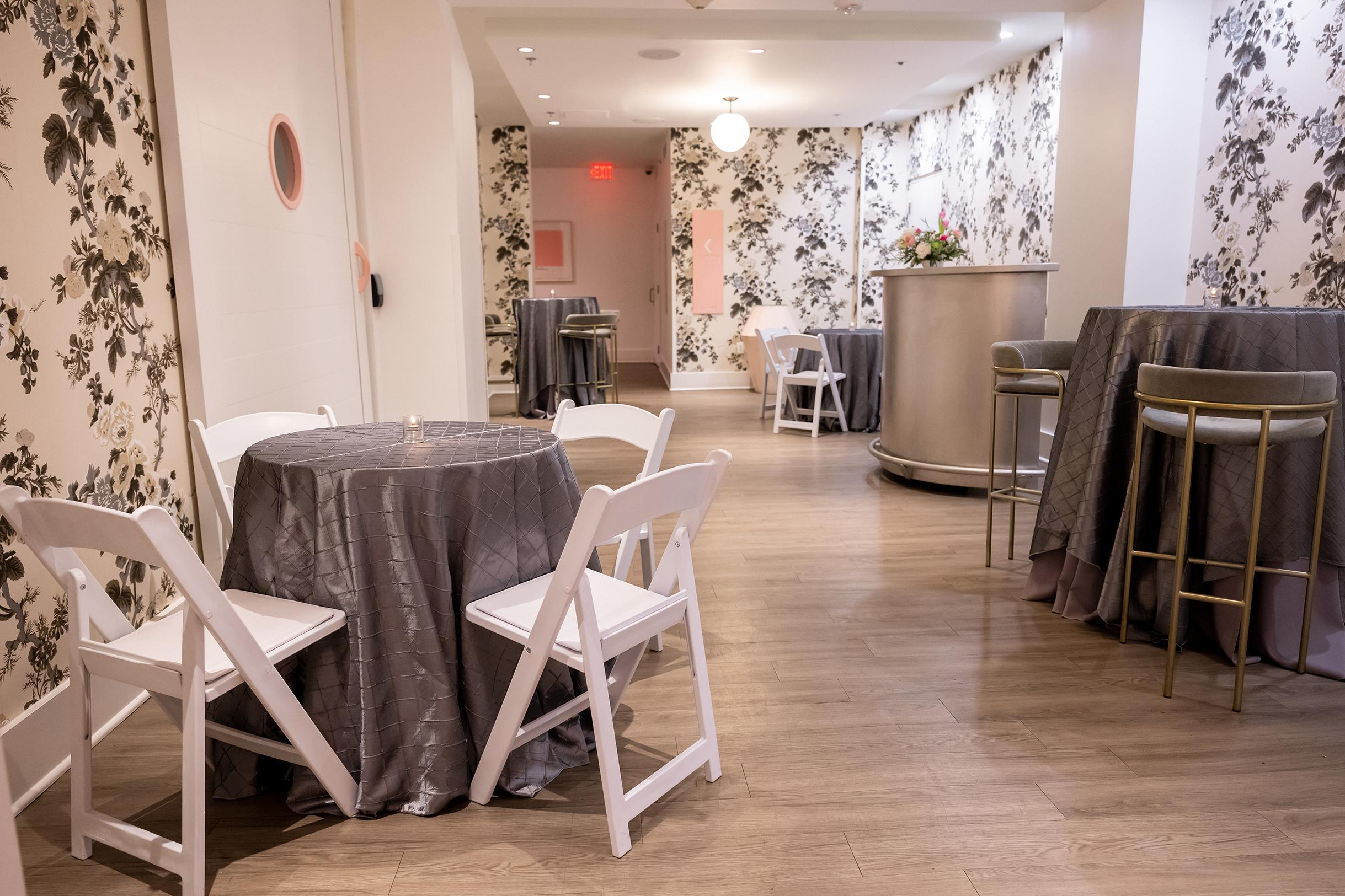 Our most traditional event space, Love & Happiness, is located on the lower level of the hotel and is perfect for cocktail receptions and dinners. This beautifully designed room features a large 70-inch flat-screen TV and a spacious pre-function space filled with art.