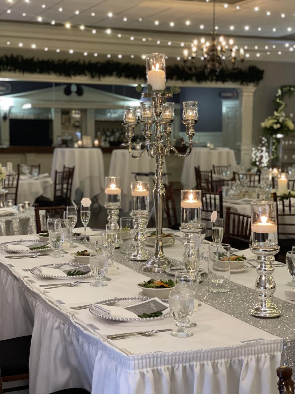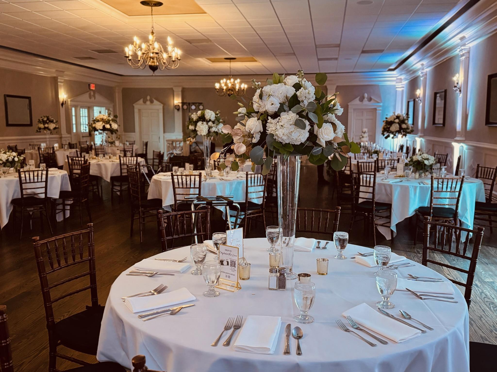 Stage for Band, DJ or Sweetheart Table | Round Tables | Chivari Chairs | White Table Linens and Napkins | Dedicated Bar | Dedicated Restrooms | Chandlers | Adjustable Lighting