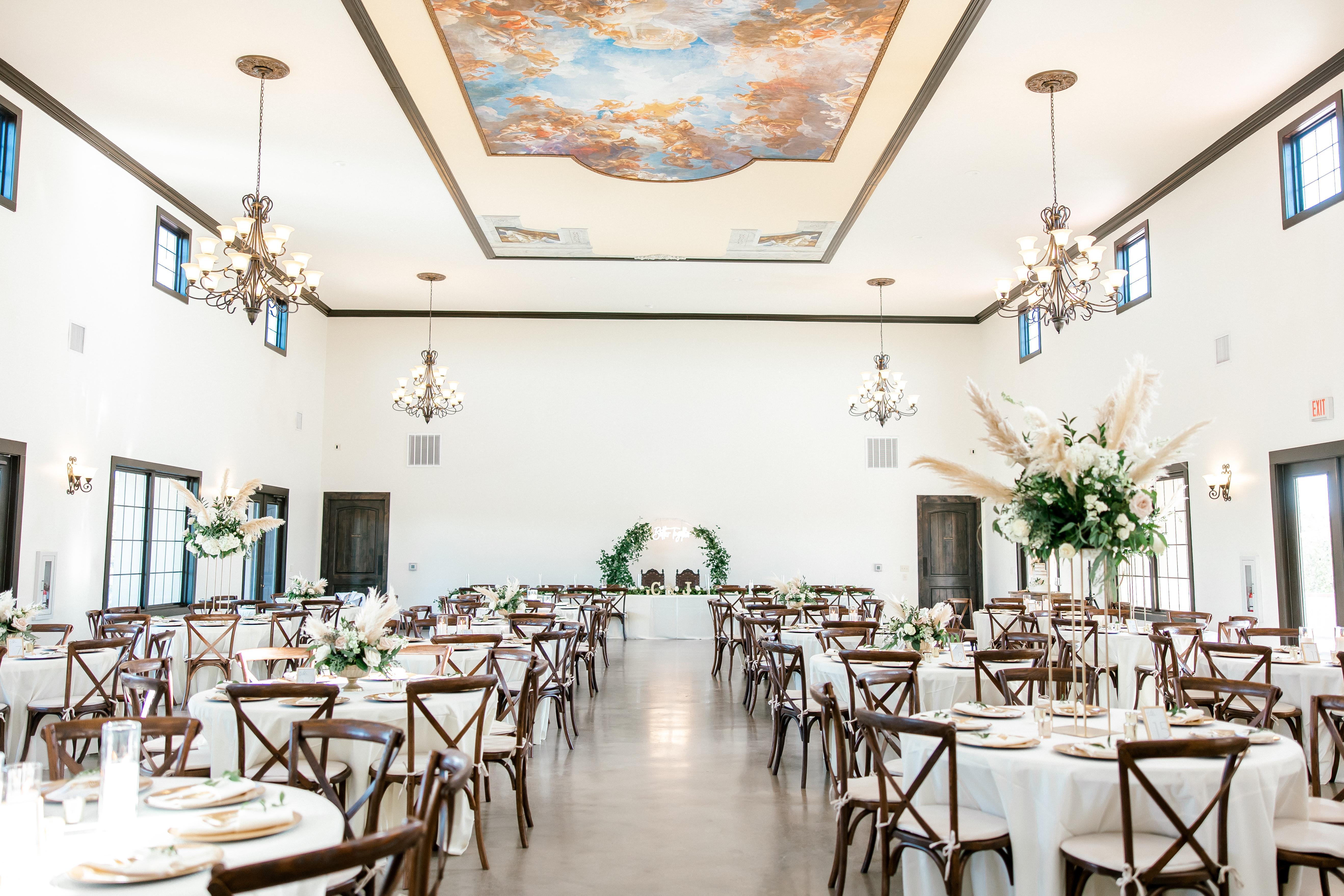 This reception hall space makes the perfect area for your wedding reception. From the artwork in its ceiling to the natural window lighting, you will fall in love!