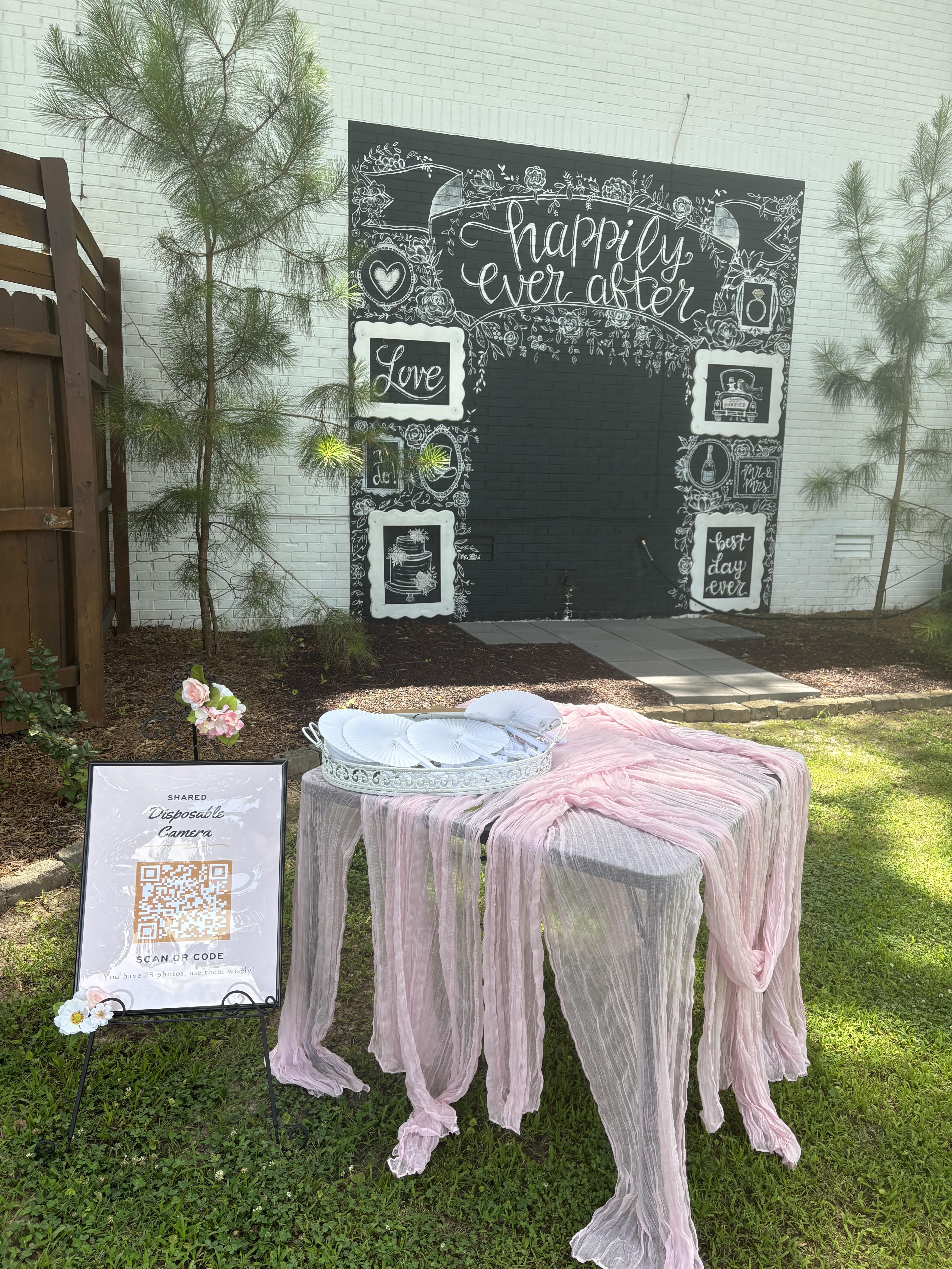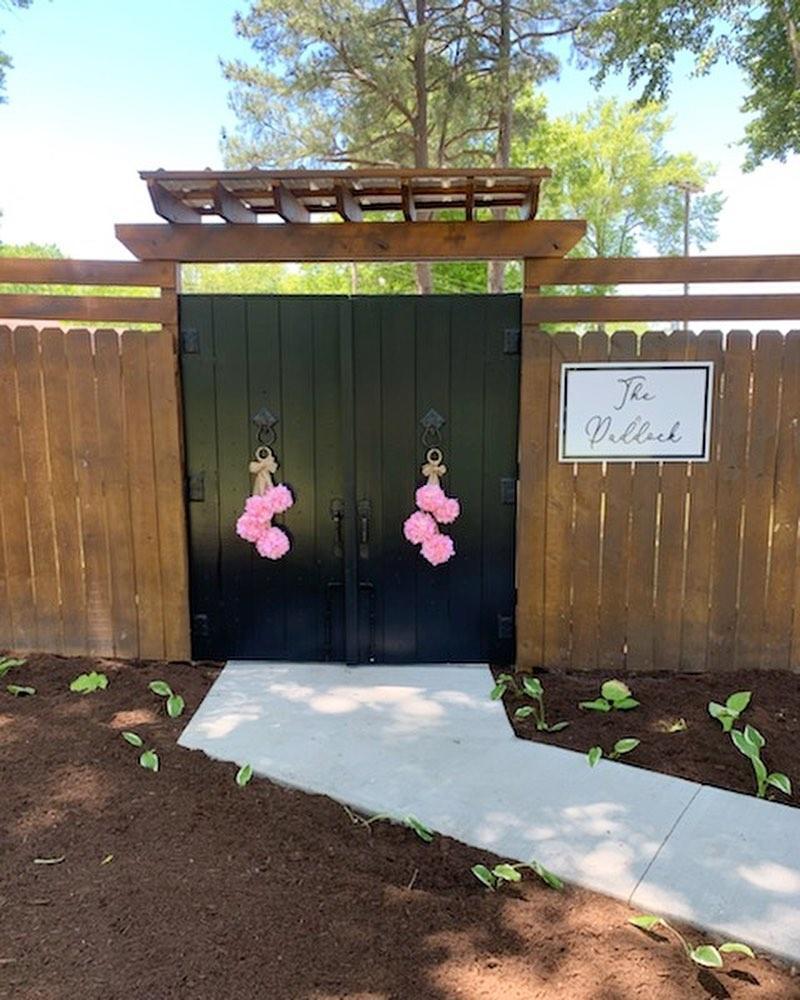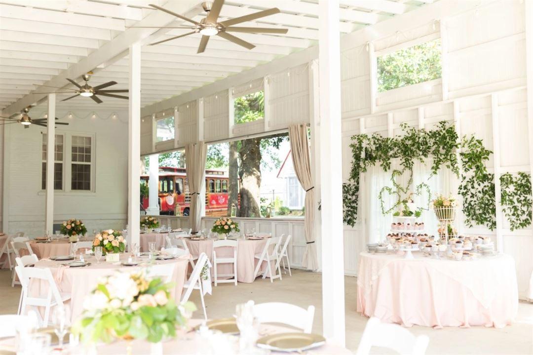 Our outdoor ceremony site is on property with the inn so it's convenient for your guests to attend your wedding and simply stroll down the path to your beautiful reception in the Grand Pavilion. The custom-built pergola with Greek columns is so pretty and mirrors the Greek Revival style of The Caldwell properties. The Paddock seats up to 150 guests. Be sure to grab your sweetheart & snap a pic under the "Happily Ever After" mural in The Paddock before you leave!