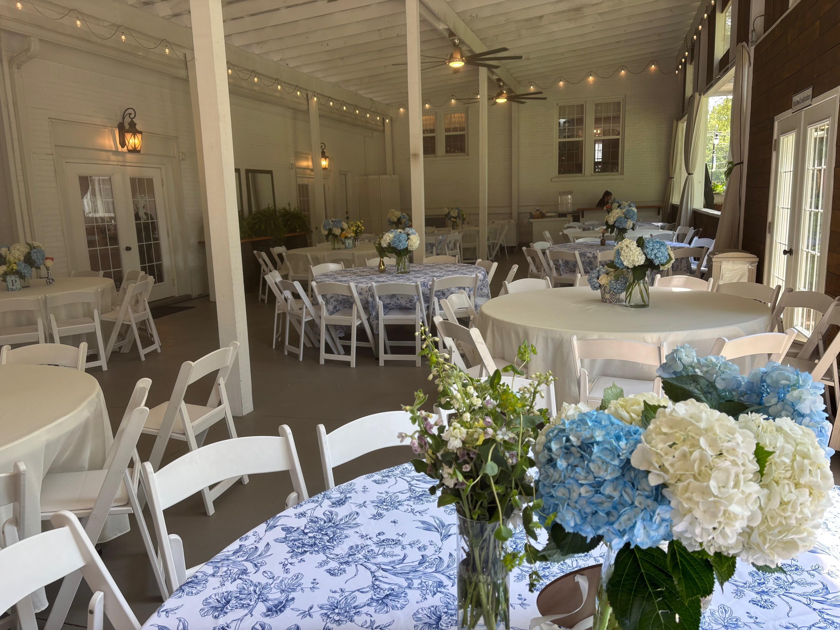 The Caldwell Pavilion is a 2,400 sq. ft. covered outdoor venue space with soaring ceilings and sparkling white party lights.