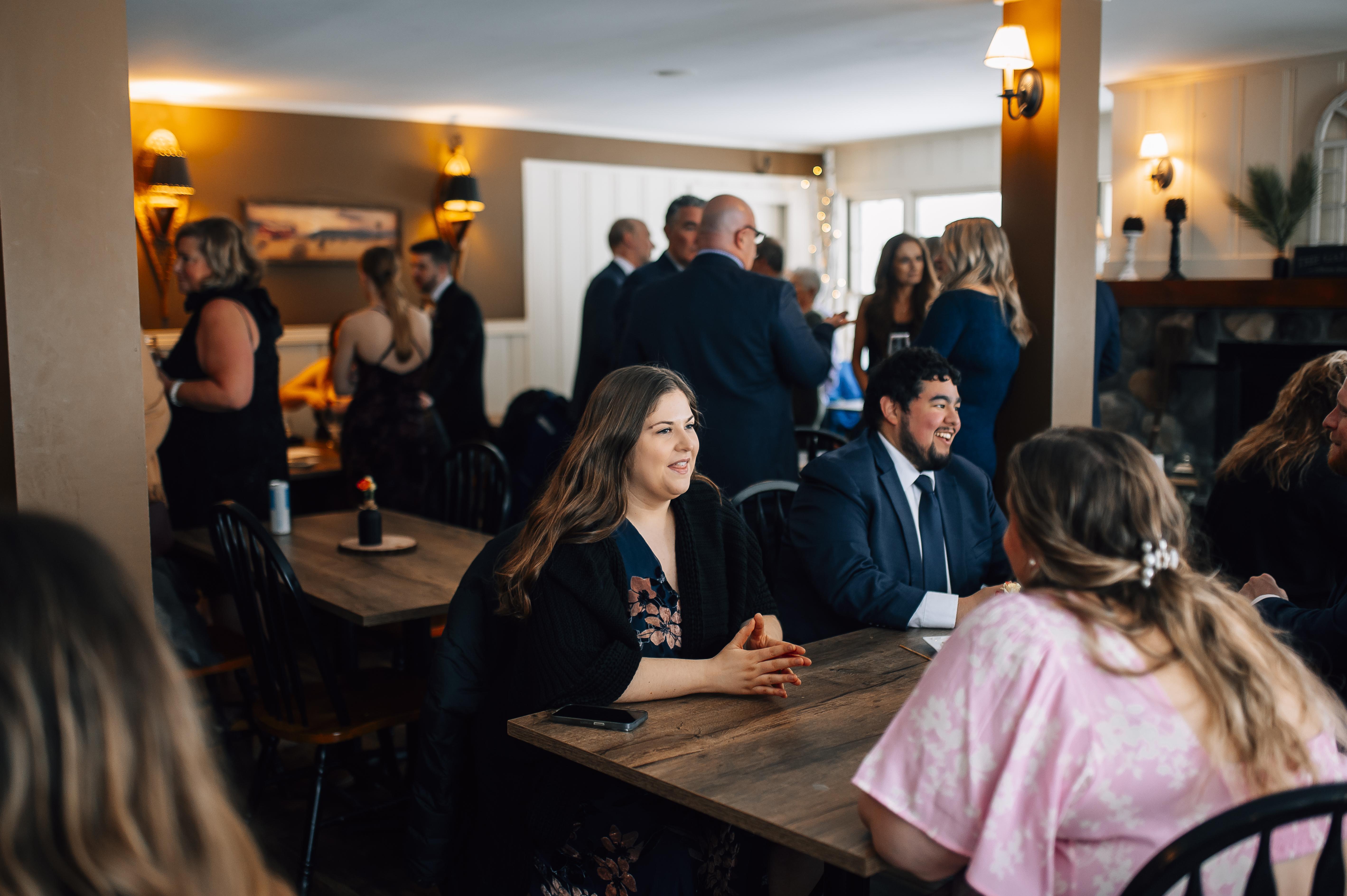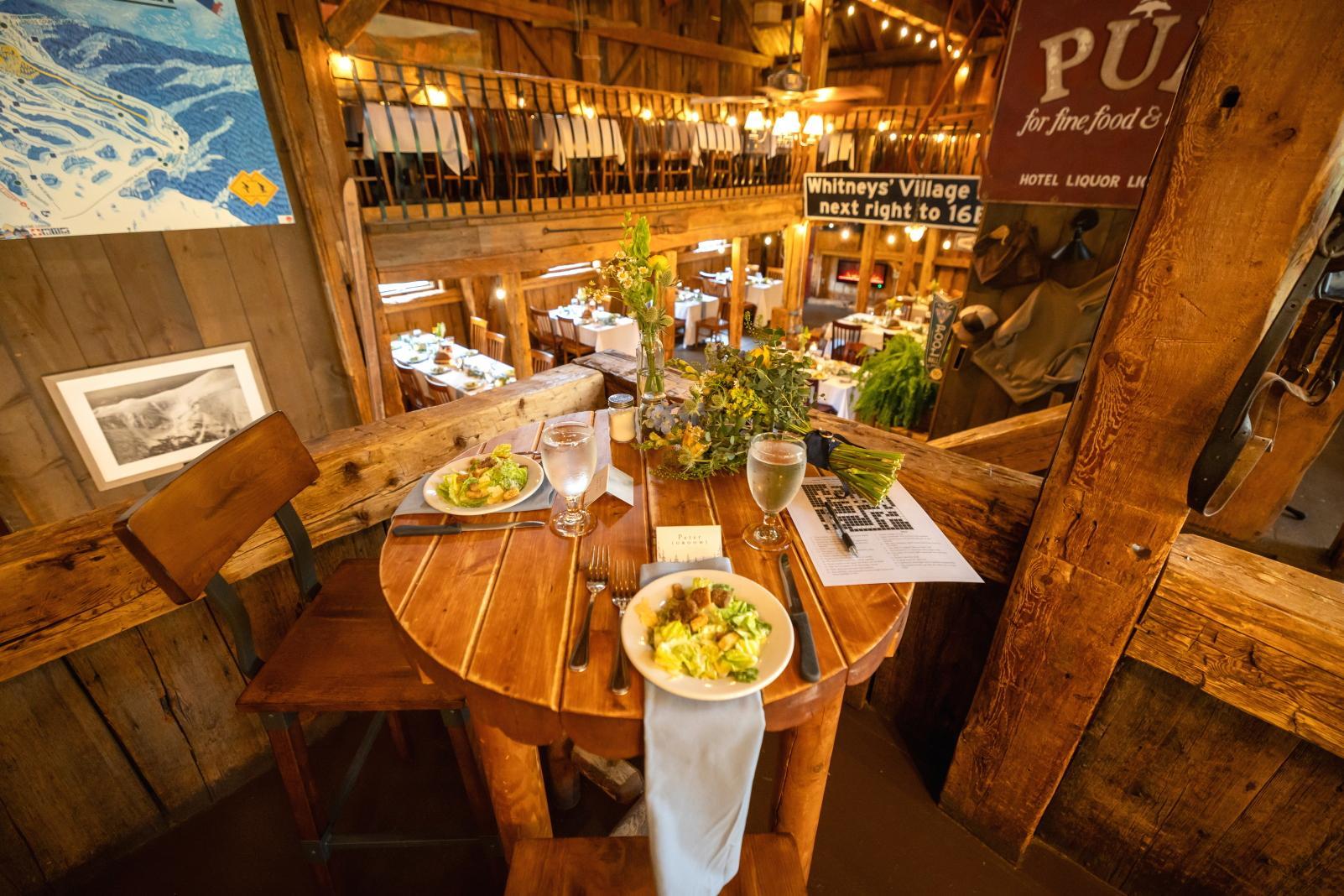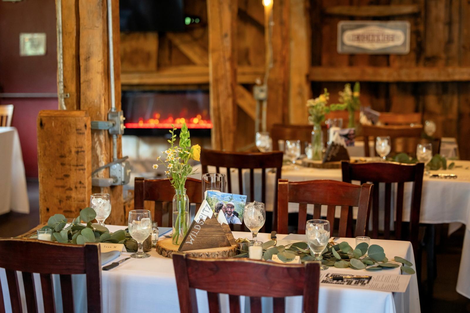 The Birches Dining Room in the Main Inn features direct access to our J-Bar, allowing guests to move effortlessly between dinner and drinks. The adjoining patio with firepit adds an outdoor element ideal for cocktail hour, welcome/rehearsal dinner, mingling, or winding down by the fire.