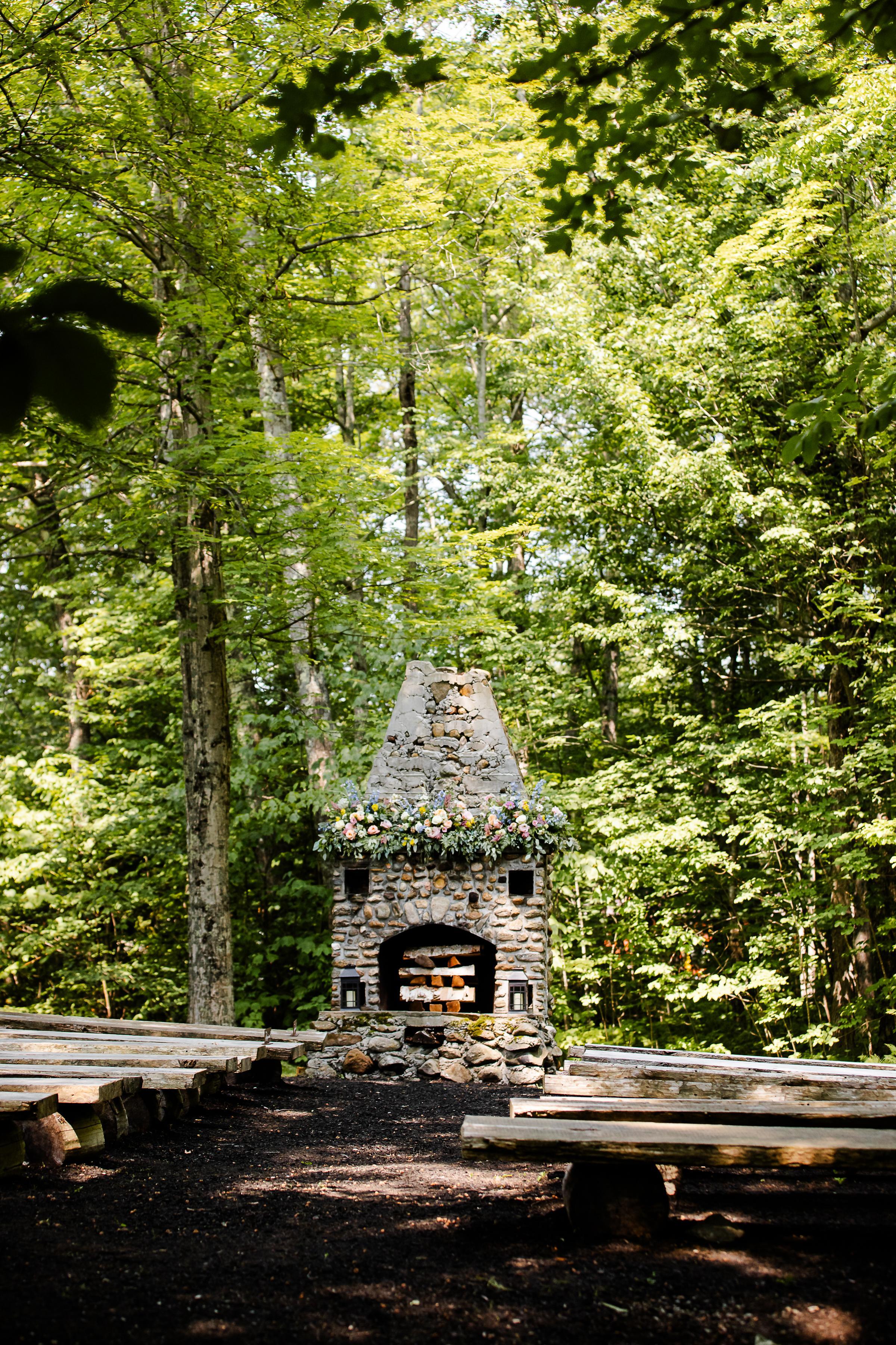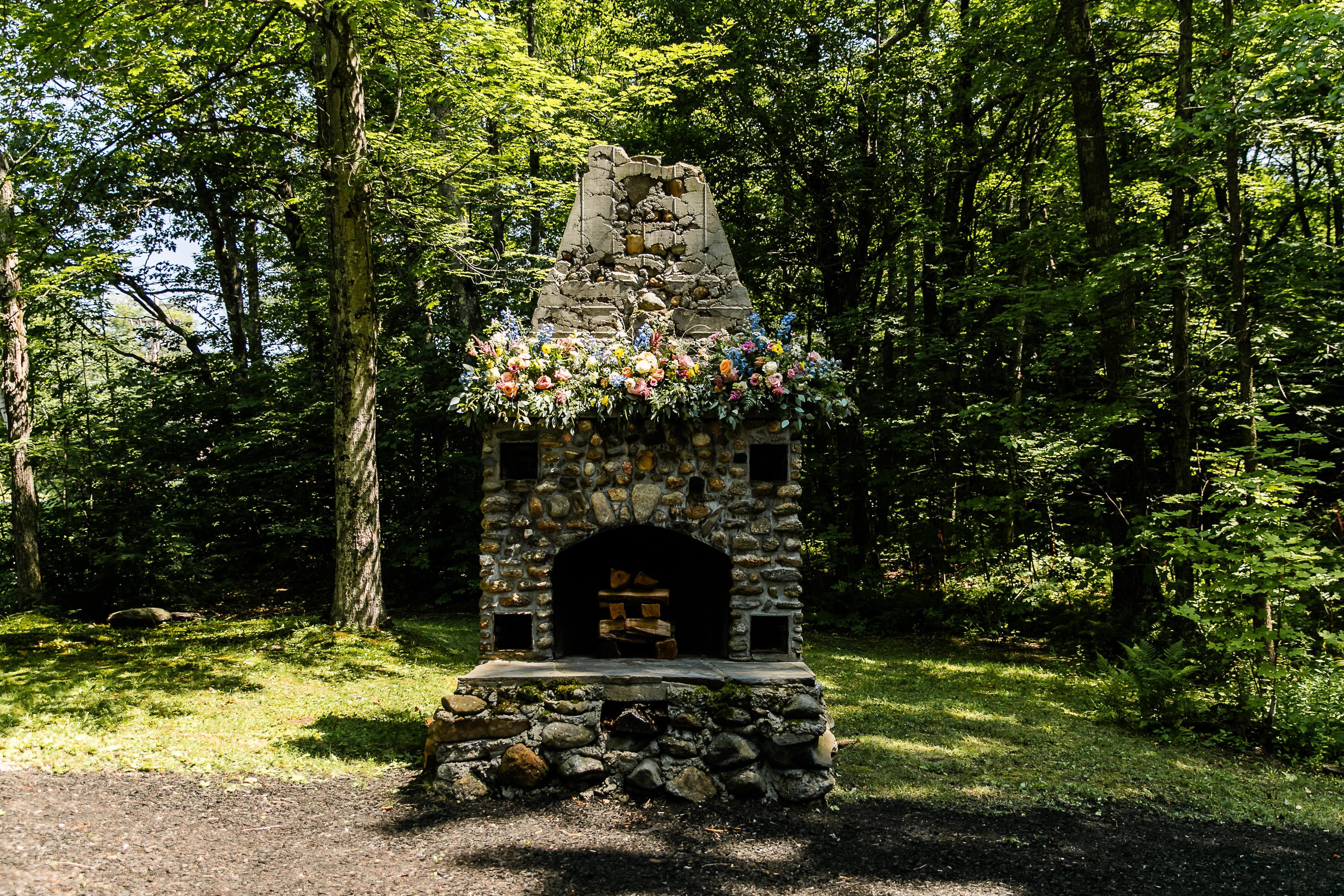 The Picnic Area. Rebuilt in 2013 and set next to a beautiful rolling stream, this amenity provides the perfect setting for a Welcome BBQ or Rehearsal Dinner. With 80′ under cover, a built-in bar, attached wood fireplace, and horseshoe pits, what a great way to start off the weekend for you guests!