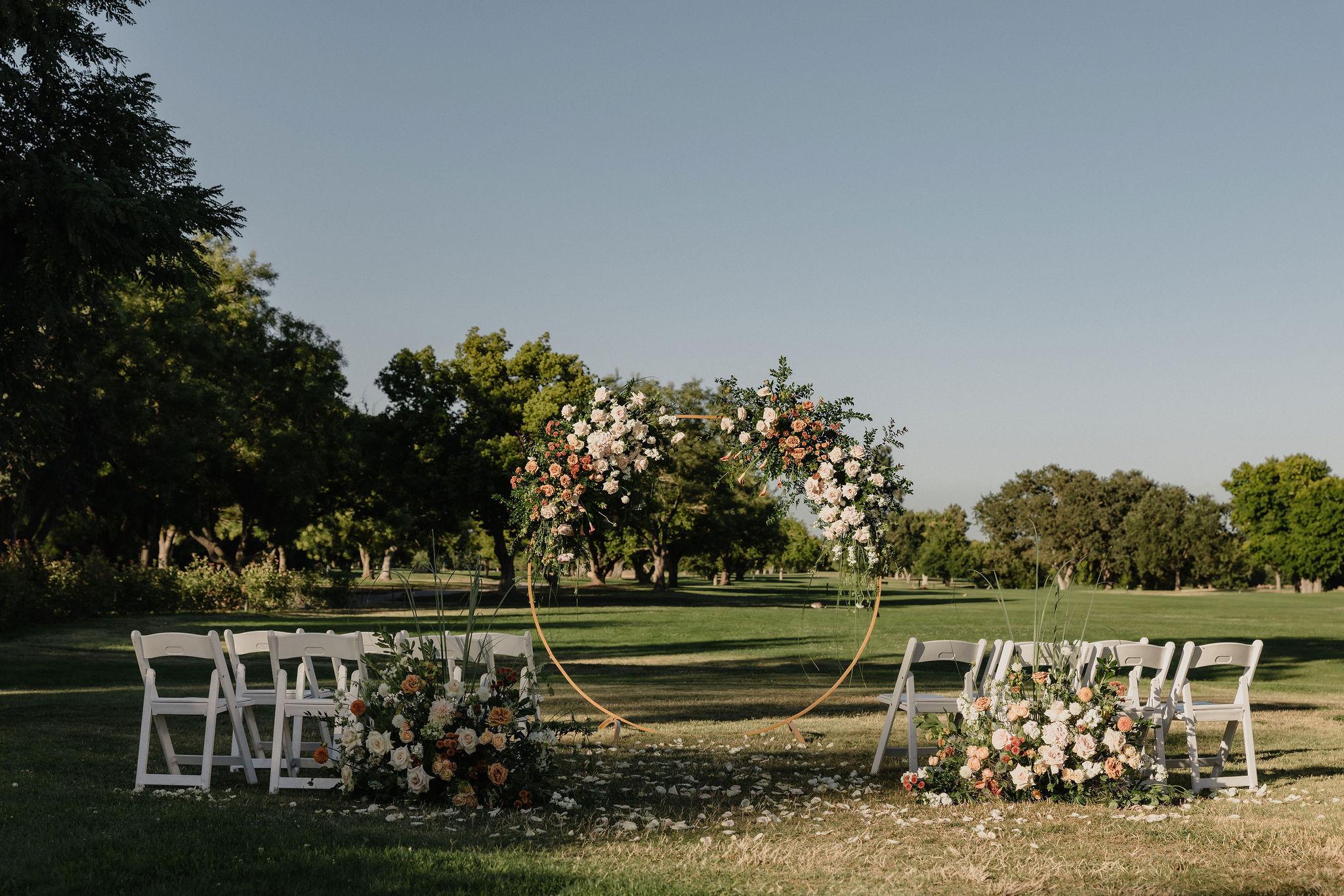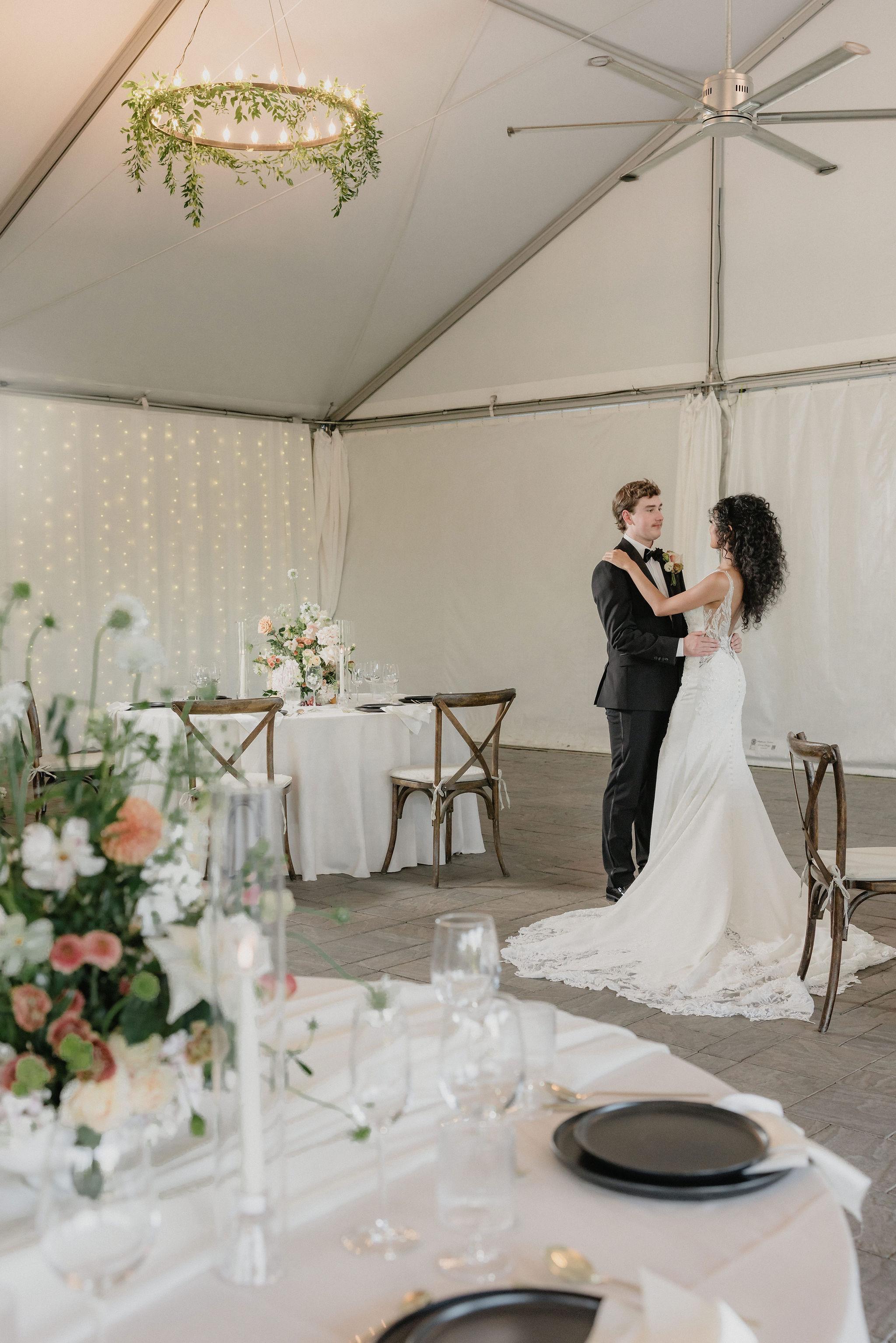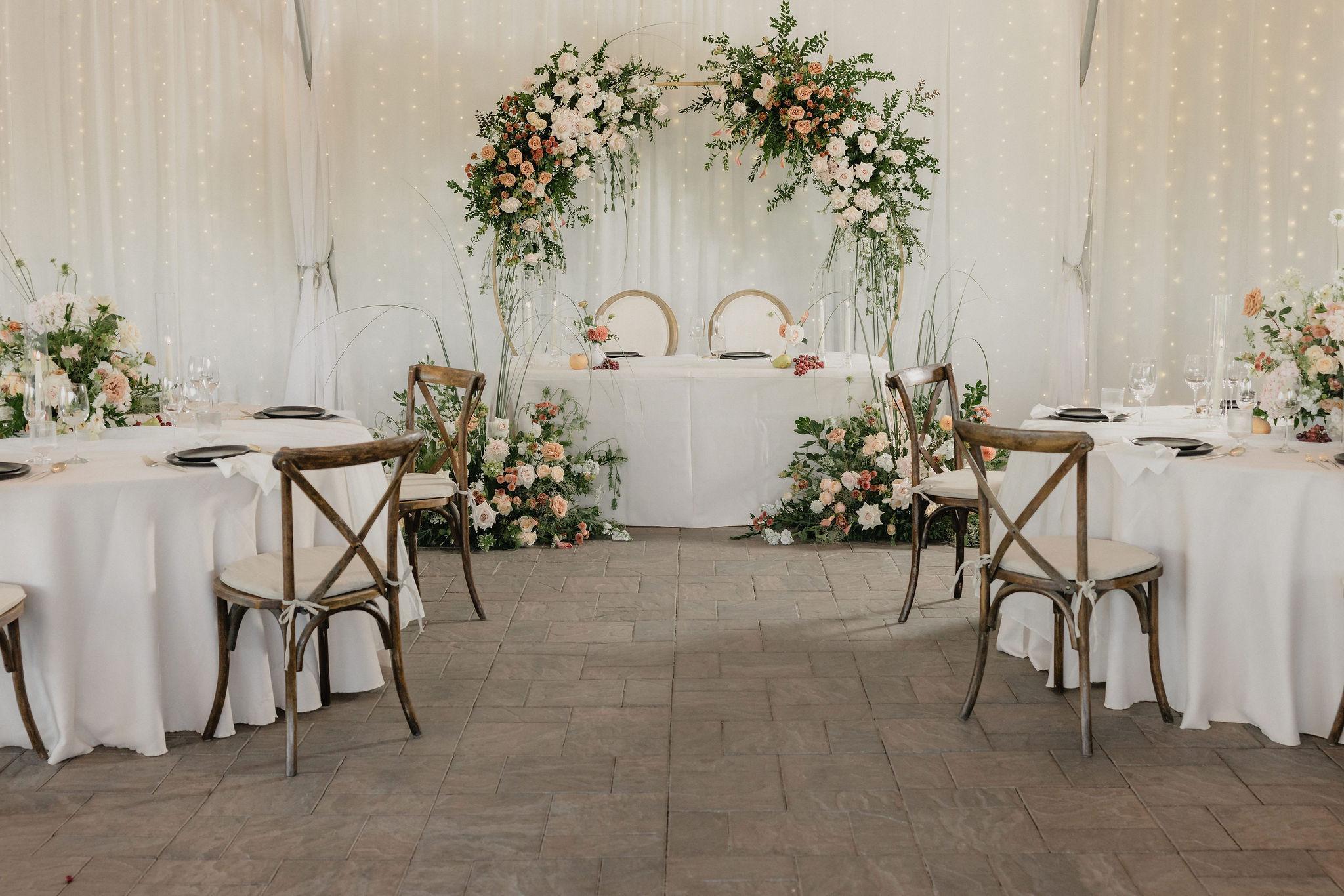 The Pavilion is a stunning, year-round white tent nestled between the scenic 17th fairway and 18th green of the Allister Mackenzie Golf Course. Inside, elegant drapery and crystal chandeliers create a sophisticated atmosphere. The experience extends outdoors to a lush garden area, where guests can sip cocktails under a charming white gazebo. This space is anchored by a magnificent 150-year-old Heritage Oak tree, providing a romantic and historic backdrop for a quintessential park-like ceremony.