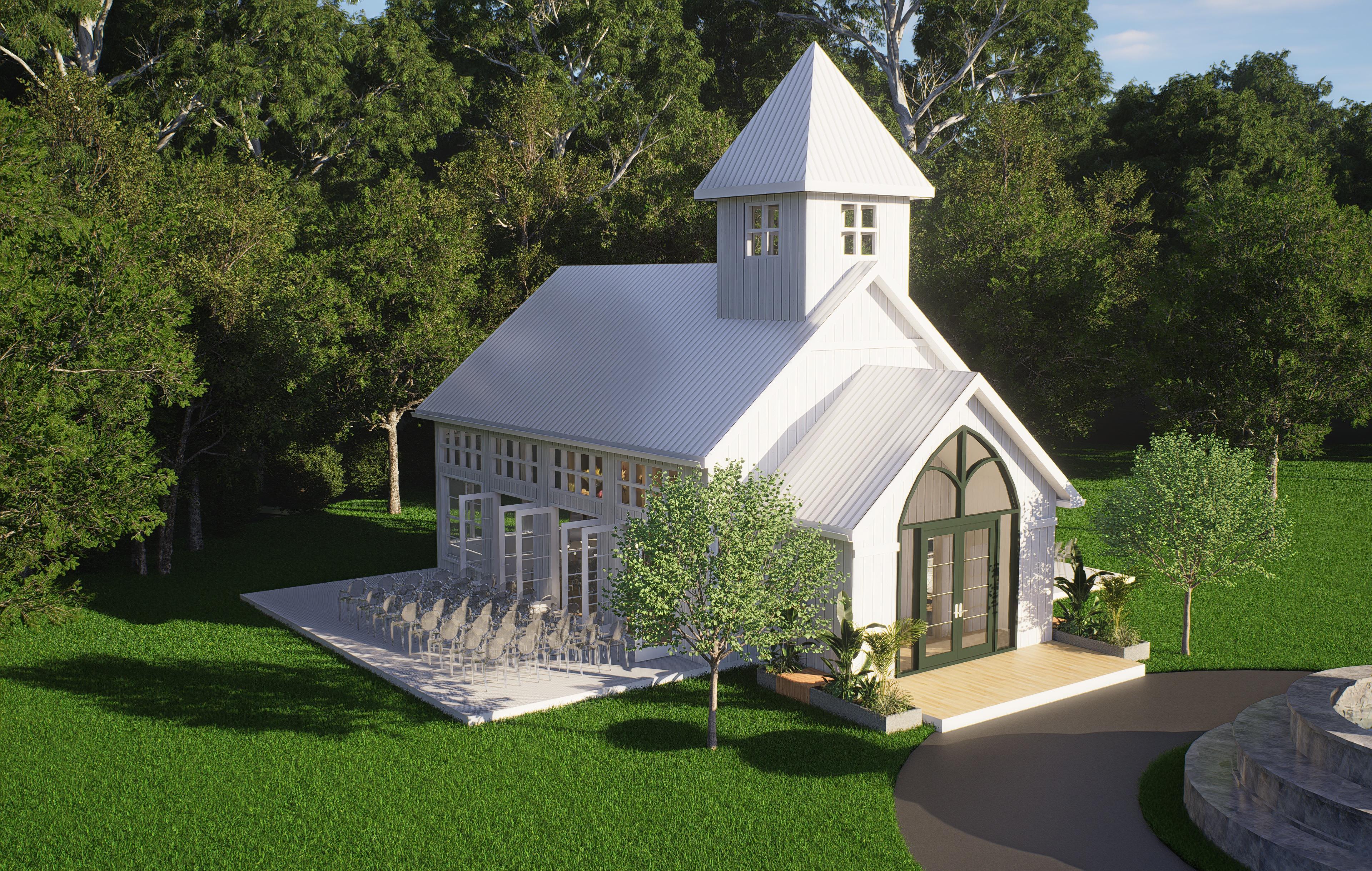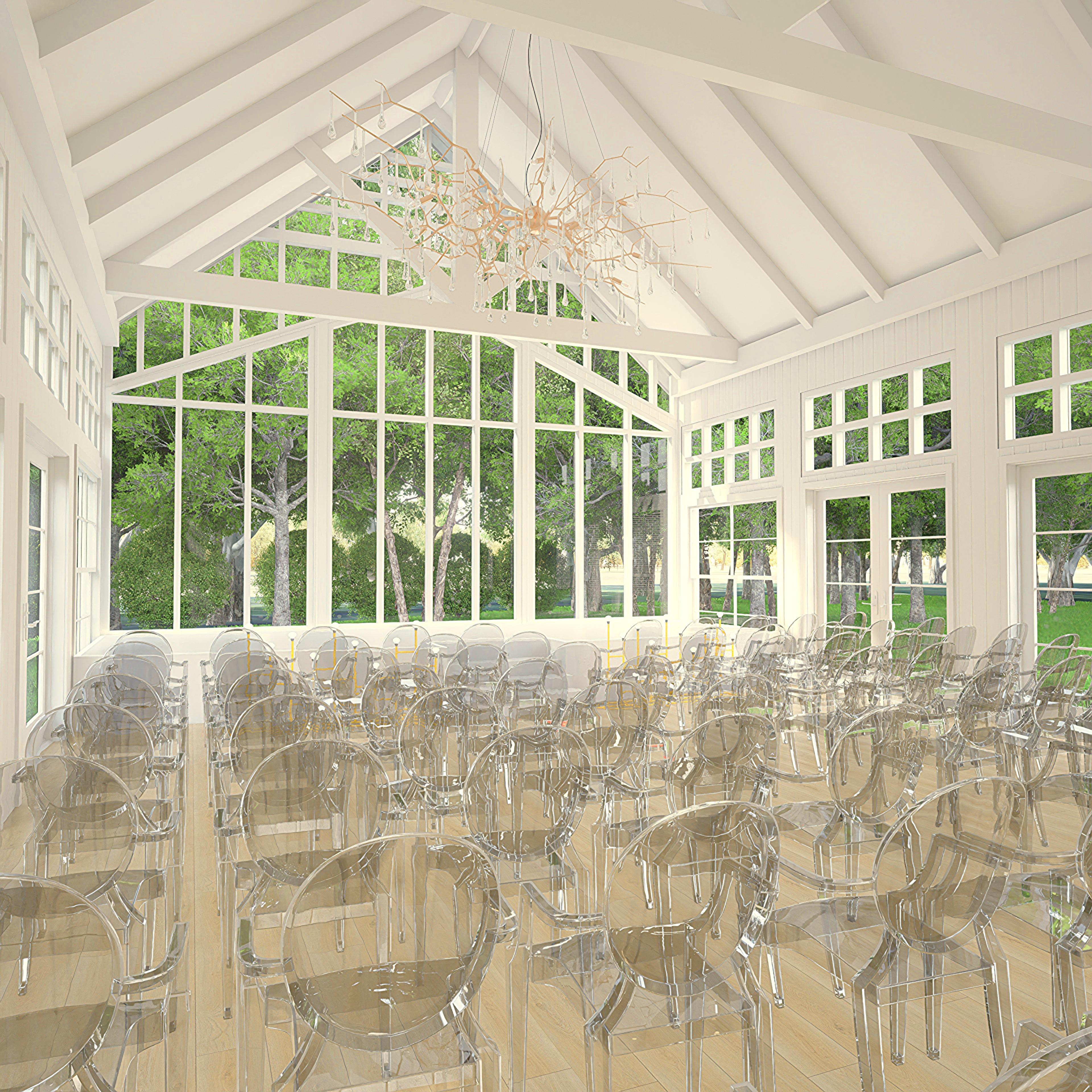 The Promise Chapel is an all-white venue featuring floor-to-ceiling glass at the altar and elegant French doors that open to sweeping countryside views. Natural light fills the space, illuminating crystal chandeliers and thoughtful architectural details. Couples may exchange vows inside the serene chapel or outdoors on the lawn. The chapel seats 96 indoors and can accommodate up to 150 guests outside for a seamless indoor–outdoor experience.