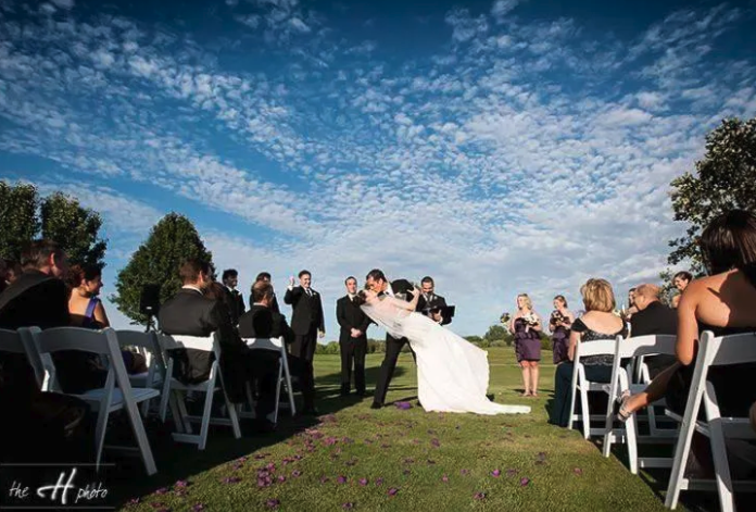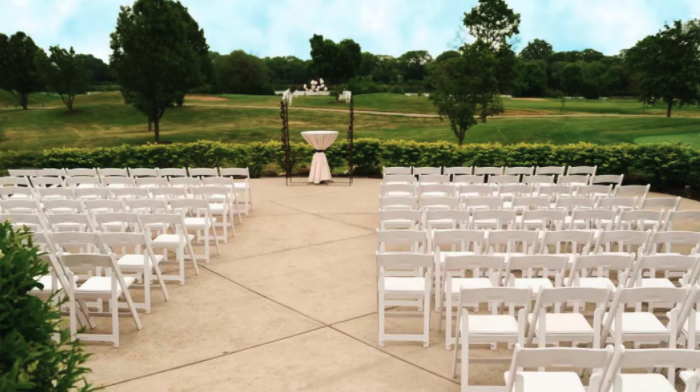 Beautiful outdoor ceremony space available with incredible views of the golf course and Lake Charles. Outdoor cocktail bar available on the terrace overlooking the golf course.